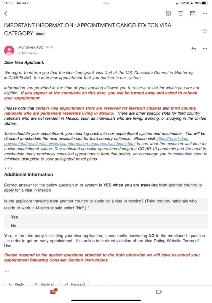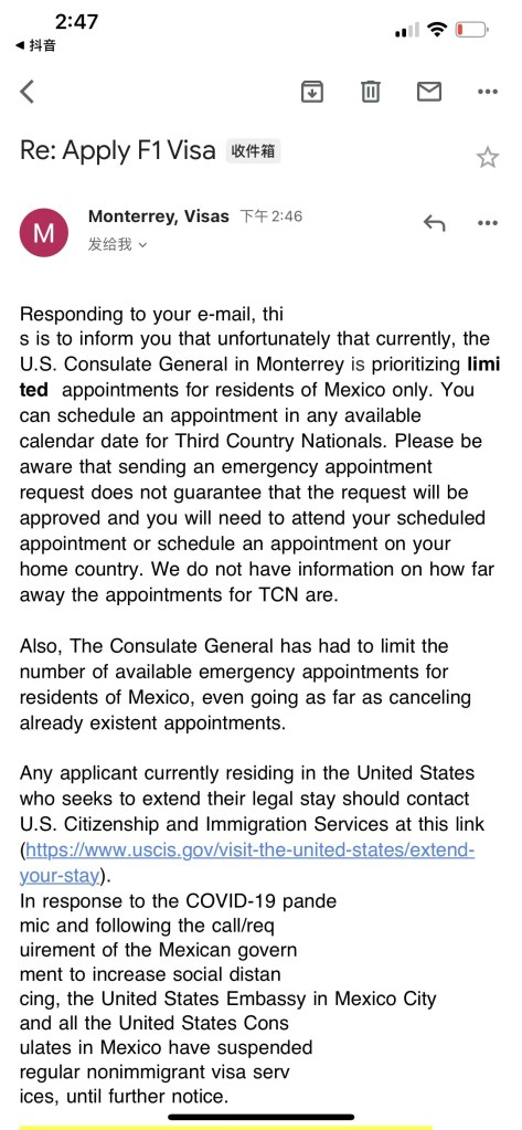 墨西哥美领馆目前不接受非本地人(TCN)的签证要求,最近很多小伙伴预约的面谈被取消, 甚至到了领馆门口被告知不予面谈.