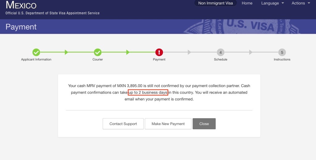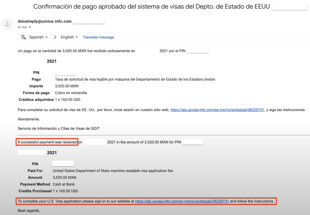 Congratulations! 我们已经在墨西哥当地的银行为您成功缴纳了签证费, 现在只等待银行系统通知签证部门系统. 再次感谢您使用小邹的缴费服务.