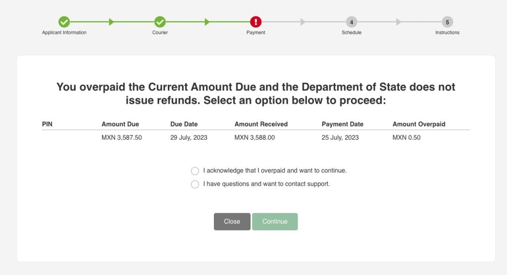 如果收到以上的讯息,请选择 “I acknowledge that I overpaid and want to continue.” 原因是缴费单上的价格有个0.5比索(3美分), ,银行不收取0.5比索的零钱,所以我们宁愿多给0.5比索也比少缴好. 两害相权取其轻,少缴的话完全不能面谈,多缴的话只是通知你多缴了. 请不用担心.